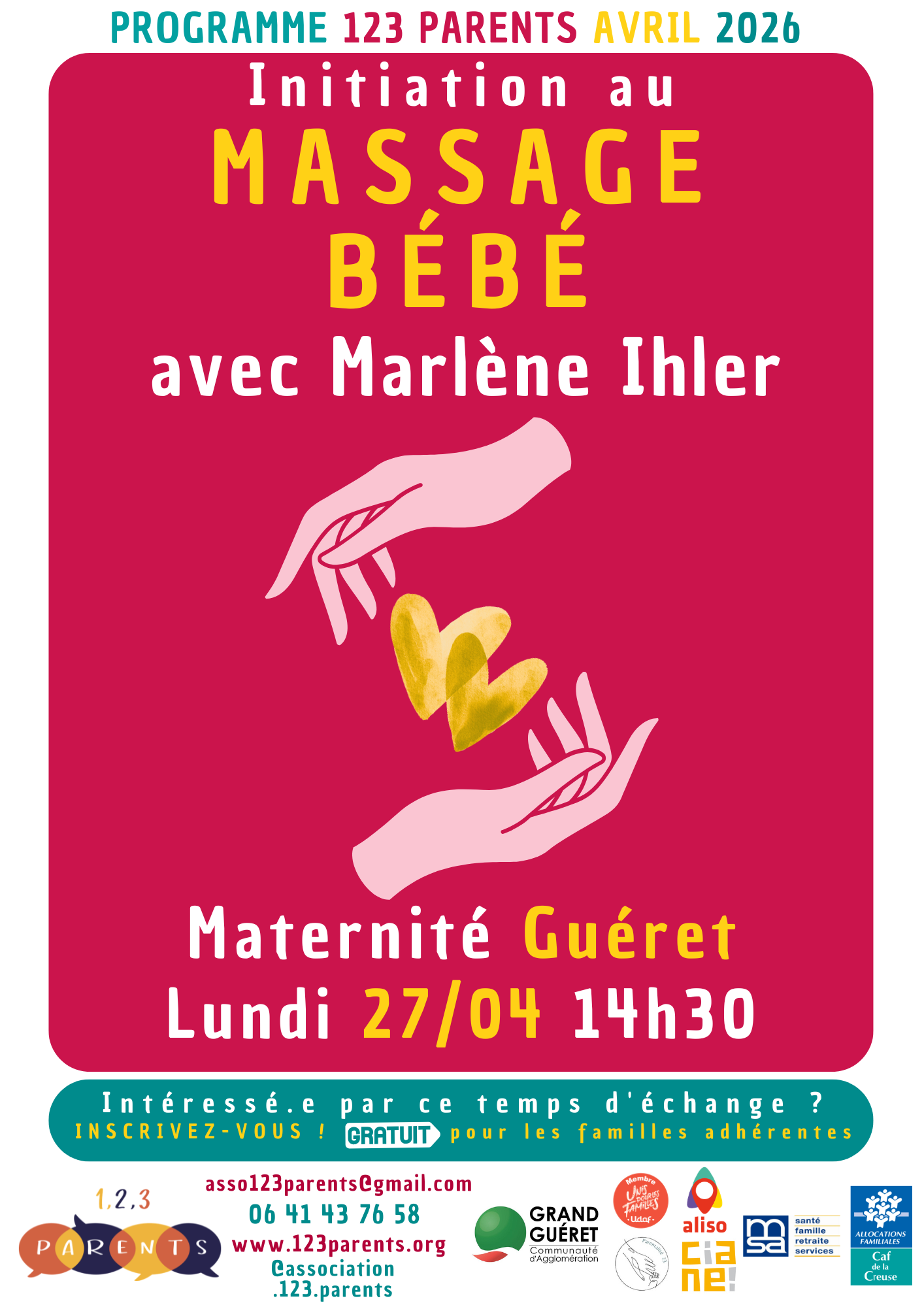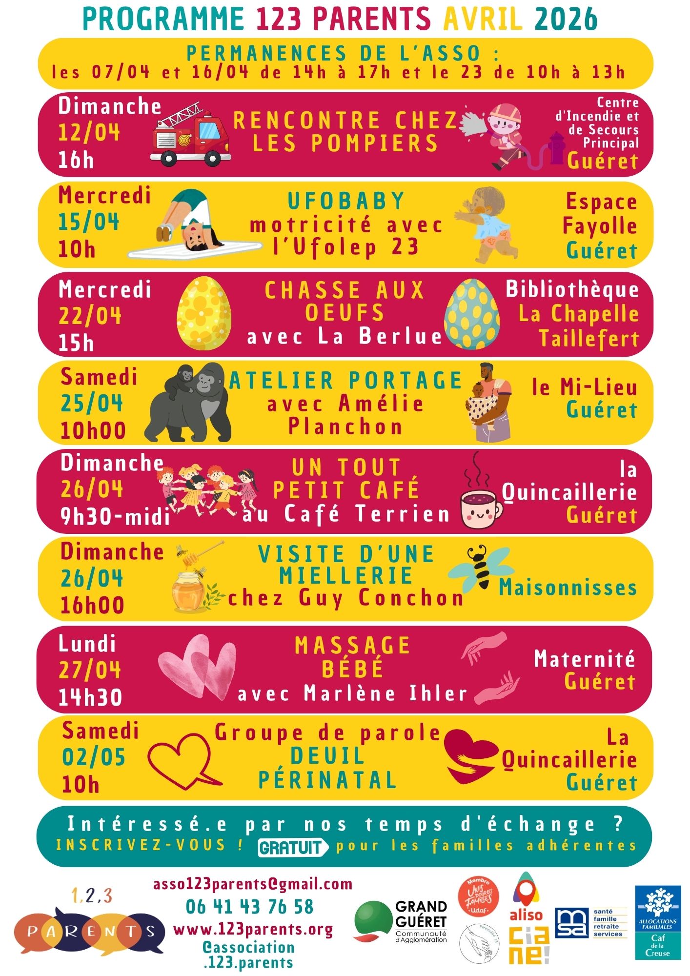C’est avec plaisir que l’on vous présente le programme du mois d’avril : visite chez les pompiers, Ufobaby, chasse aux oeufs, portage, massage & visite d’une miellerie, que d’activités à faire en famille !