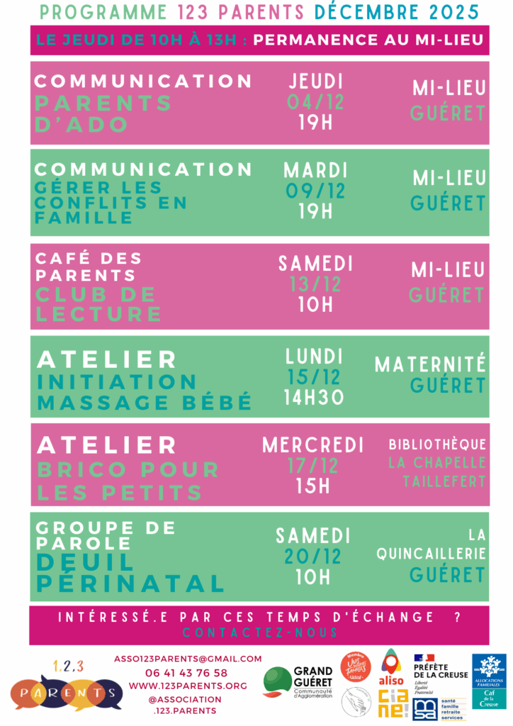Il pleut, il fait froid, les cheminées fument & le bout du nez est rouge… On n’est pas encore le 21 décembre, mais ça y est, l’hiver est là ! Pour vous réchauffer, on vous a prévu quelques ateliers et temps d’échange : découvrez la communication bienveillante avec Julie Dupas lors de deux ateliers (« Parents d’ado » et « Gérer les conflits en famille »), partagez avec nous vos coups de coeur lecture pour les petits avec le « Club de lecture » animé par des bénévoles de l’association, initiez vous au massage bébé à la maternité avec Rachel Catel EI réflexologue, venez bricoler et patouiller à la Chapelle Taillefert, et venez déposer vos maux pendant le groupe de parole sur le Deuil Périnatal avec Valerie Arnault Moutaud. Toutes ces rencontres sont gratuites, pensez à vous inscrire : asso123parents@gmail.com ou 06 41 43 76 58