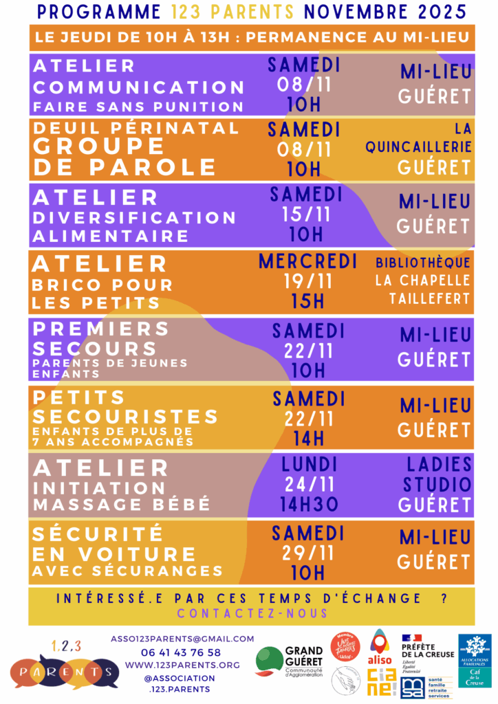 Participez au massage bébé pour renforcer le lien avec votre tout-petit, apprenez à faire sans punition grâce à Julie Dupas, découvrez les joies de la diversification alimentaire avec Stacha, laissez parler votre créativité en venant bricoler en famille à la bibliothèque, rassurez-vous avec un atelier « Secourisme en famille » ou « Sécurange », venez déposer vos doutes et votre tristesse dans un groupe de parole, ou venez nous rencontrer lors de nos permanences hebdomadaires au Mi-Lieu. Il y en a pour tous les goûts ! Nos activités sont pensées pour tisser des liens authentiques et vivre des expériences inoubliables ensemble.